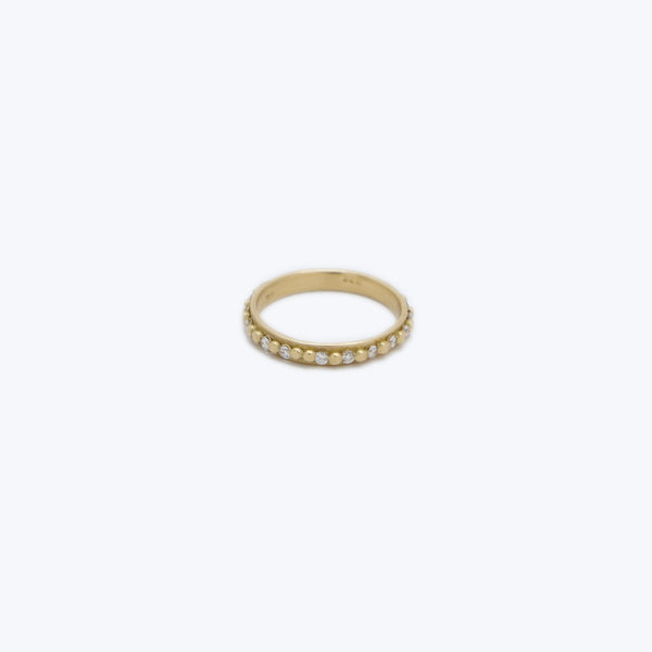 This Raised Dot Band with Sprinkle Diamonds is a wonderful addition to any stackable band set. Combining simplicity with sparkle, this diamond band features a continuous line of raised diamonds and solid gold dots. This handmade ring makes a wedding band or special occasion ring that stacks beautifully with others from Ananda Khalsa or different ring brands. Size 6.Ananda Khalsa draws inspiration from natural forms and the vibrant luminosity of natural gemstones. She strives to capture the precious quality found...
