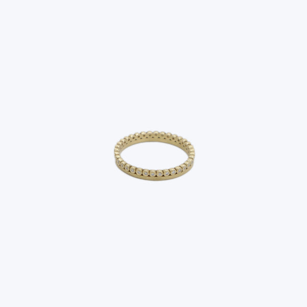 This Side Diamond Line Band showcases an elegant, lacy look of single dots set with a sparkling diamond on top of a delightful 18k yellow gold band and matte finish. This handmade ring makes a stunning engagement ring, wedding band, or special occasion ring that stacks beautifully with others from Ananda Khalsa or different ring brands. Size 6.Ananda Khalsa draws inspiration from natural forms and the vibrant luminosity of natural gemstones. She strives to capture the precious quality found in...