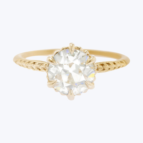 This Evergreen Solitaire Engagement Ring features hand-carved golden botanicals flourishing and subtle beading paired with sophisticated claw prongs to cradle the most precious of antique Old European cut diamonds in high-quality recycled 18k yellow gold.The body of this stone is the loveliest creamy ivory, with a lit-from-within glow and lush faceting that will make you fall in love with the exceptional character of antique cuts. No modern brilliant can hold a candle. A truly special forever piece.Antique old European cut...