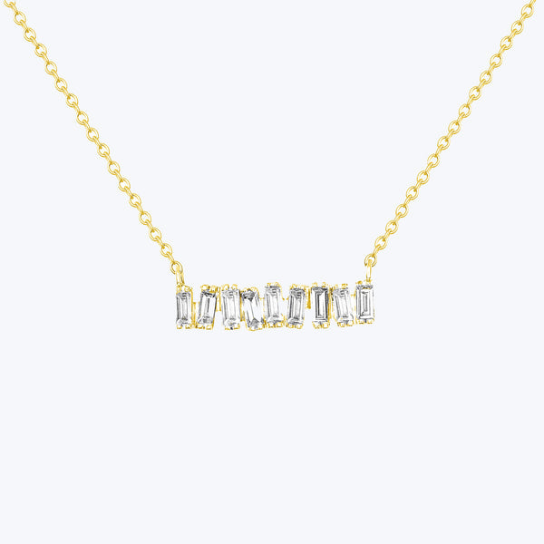 This Exquisite Necklace is true to its namesake with nine baguette diamonds on an 18k yellow gold chain. A lovely diamond necklace for everyday wear and formal occasions. Ele Keats fine jewelry is mindfully crafted from ethical stones in Los Angeles, California.