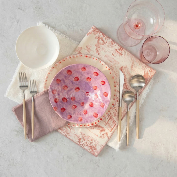 Each short glass is hand-blown into custom molds and hand-painted. This process may result in subtle variations, lending to the individual character of each glass. Dishwasher and microwave safe.
