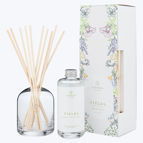 Containing notes of cut grass, lavender, and hay, the FIELDS Diffuser by LINNEA celebrates nature's best season. This exquisite diffuser includes a refillable mouth-blown glass vessel, natural rattan reeds, and LINNEA's premium FIELDS scent blend. LINNEA home fragrances are non-toxic, eco-friendly, and cruelty-free. Sustainably made in the USA.
