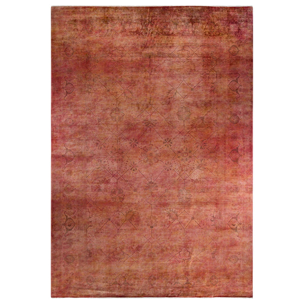 This Orange Overdyed Wool Rug - 10' 1" x 14' 1" is a luxurious addition to any space. Hand-knotted in Pakistan, its blend of earthy red and soft pink hues creates a beautifully distressed look. Its subtle ornamental pattern adds depth and texture for a warm and dynamic look.