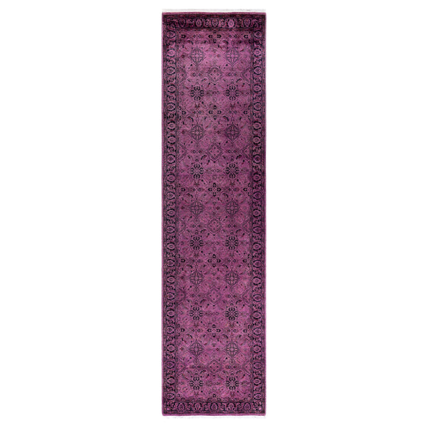 This Purple Overdyed Wool Runner - 3' 0" x 11' 10" is a luxurious piece from Pakistan. Featuring deep pinks and dark accent hues in a floral and ornate design, it exudes sophisticated and traditional elegance. This hand-knotted overdyed runner is a stunning addition to any space.