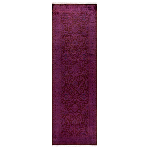 This Purple Overdyed Wool Runner - 2' 7" x 8' 4" is an elegant and sophisticated statement. Hand-knotted in Pakistan, it features a rich purple color with an intricate and traditional pattern. This runner is perfect for adding color or intricate, regal design to any room.