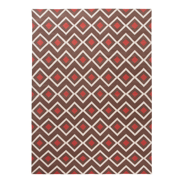 A hand-woven masterpiece emerges from India, a cotton flatweave rug that commands attention without overshadowing its surroundings. It’s the nuanced symmetry of the design that catches the eye first—a meticulous dance of bold red diamonds set against a rich brown canvas, with crisp off-white zigzags weaving an intricate grid that ties it all together. At 8 feet, 10 inches wide and 11 feet, 10 inches long, its scale generously defines spaces, whether anchoring a living room, dining ensemble, or bringing...