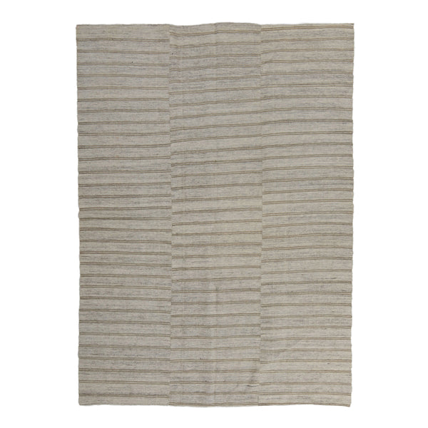 This hand-woven flatweave wool rug originates from Turkey, offering both durability and a refined aesthetic. Measuring 6 feet by 8 feet 4 inches, this rug provides substantial coverage suitable for various living spaces. It is crafted entirely from wool, known for its natural resilience and soft texture underfoot. The rug features a versatile grey color palette. Its design includes subtle horizontal stripes in a slightly darker, contrasting hue, providing a structured yet understated pattern. As a kilim-style flatweave, it exhibits...