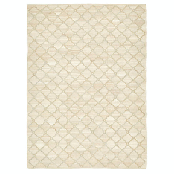 A 10' x 14' flatweave wool rug nestled into a space is not just an accent. It's a declaration. This particular rug, hand-woven from 100% natural wool, weighs in at a substantial 70 lb, bearing testimony to its well-constructed fortitude. Such heft promises not only durability but a comforting permanence, ready to handle the patter of feet in even the busiest homes. Subdued in a stunning white, its flat, pile-less surface seems to whisper rather than shout its sophistication. There's...
