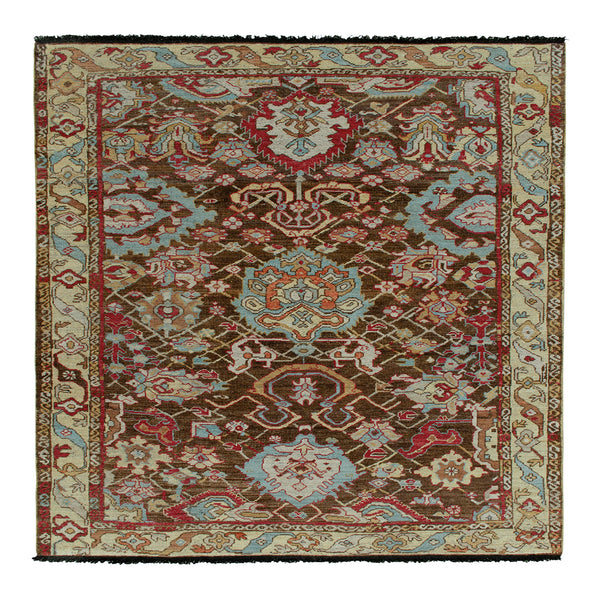 In a living space craving character, a hand-knotted wool rug from India lays down an invitation. At 5 feet 8 inches by 8 feet 5 inches, its dimensions command attention without overwhelming. The rich brown background centers the room, a canvas for the intricate dance of light blues, deep reds, soft creams, touches of orange, and hints of gold. These colors invite the eye to linger longer, to engage in the conversation started by the traditional motifs rendered with a...