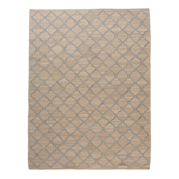 The beige flatweave wool rug, at a commanding 9' x 12', is not just a floor covering—it's a declaration of style and a nod to tradition. The essence of this rug is captured in its time-honored kilim techniques, hand-woven with precision to marry form and function. Its natural beige surface serves as a warm, inviting canvas, while a symphony of grey geometric patterns dances across it, suggesting movement without chaos, elegance without ostentation. Crafted entirely from wool, a material revered...