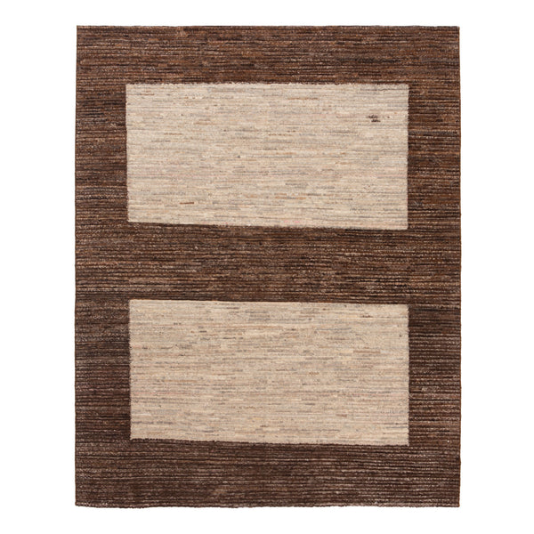 Commanding attention yet exuding a warm embrace, this hand-knotted wool rug from Central Asia is an anchor of modern style, rich in practicality and aesthetic allure. Measuring 6'6" by 8', it distinguishes itself with a striking design that's both bold and sophisticated. A deep brown border frames two spacious rectangles of natural light beige wool, crafting a geometric pattern that seamlessly blends the traditional with the contemporary. Made entirely of wool, its soft texture has a quiet resilience, an invitation...