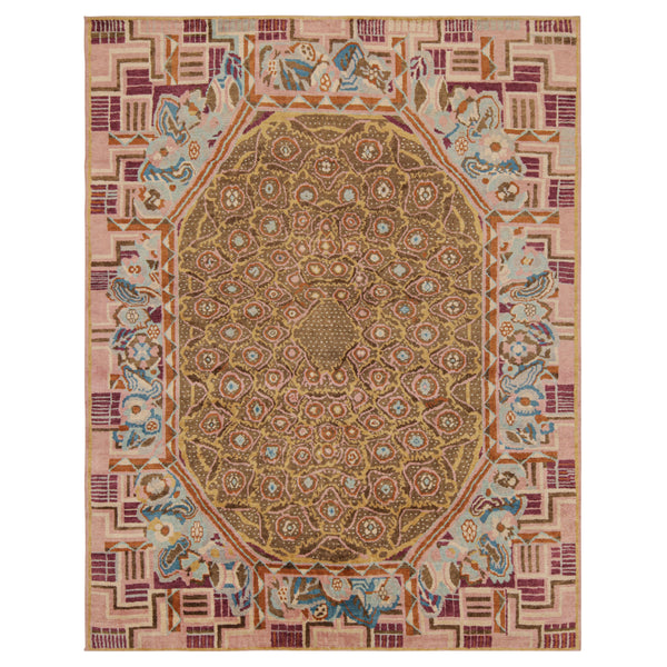 This Pink Contemporary Wool Rug - 8'5" x 10'7" features a vibrant mix of colors and intricate patterns, including a central mandala-like design in shades of brown, gold, and blue. Hand-knotted in India from high-quality wool, this rug adds warmth and elegance to any room with its traditional craftsmanship and authentic fringed detailing.