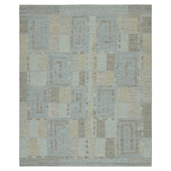This Blue Moroccan Berber Wool Rug is a striking piece featuring an abstract geometric pattern in shades of gray and blue. Hand-knotted in India, this high-quality rug is made of wool is perfect for any living area or office. Add a touch of modern elegance to your space with this 8'6" x 10'1" Moroccan rug.