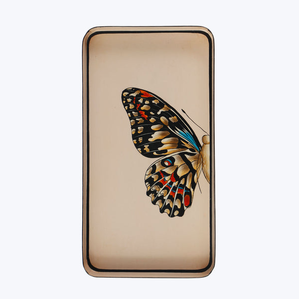 A symbol of transformation and hope, this Flora Wing Handpainted Iron Tray adds a whimsical touch to your living room, dining room, or kitchen. The magic of the butterfly is displayed here in this iron serving tray with a butterfly wing surrounded by a neutral cream background. Striking even when empty, this handpainted tray works well as a catch-all for keys and small objects in your entryway, serving drinks and hors d'oeuvre at dinner parties, holding tchotchkes on your coffee...