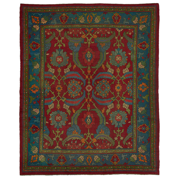 Majestic and storied, this Red & Blue Antique Irish Donegal Rug spans grandly at 12'2" by 14'1". It's not just a carpet; it’s an experience waiting to unfold underfoot in expansive spaces. At its heart is a deep red field, vividly alive with intricate floral motifs and meandering vines. Shades of blue, teal, green, and whispers of orange dance among the stylized blooms and flowing leaves, culminating in a tapestry of timeless elegance. A substantial blue-teal border gracefully frames this...
