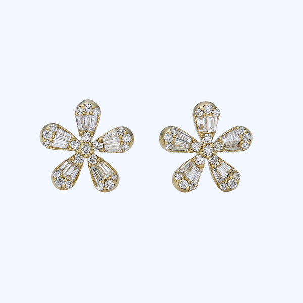 The contemporary Flower Diamond Studs are crafted in 14K yellow gold with 0.23 ct. round diamonds and 0.36 ct. baguette diamonds with a post back.