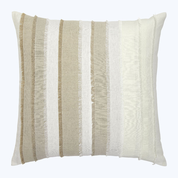SpecificationsUpcycled fringed linen strips, hidden zipper closure, solid on reverse.