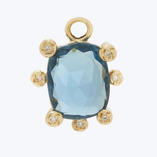 Meet the Genie Charm with Blue Topaz and Diamonds, inspired by Scosha's travels through Morocco filled with bright lights and colors! Cast from solid 14k yellow gold, this jewelry charm includes a faceted London blue topaz center stone surrounded by glistening white diamonds. All Schosha Genie Charms are designed to fit any classic huggies hoop or easily added to your favorite charm bracelet or necklace chain with a charm enhancer, each sold separately. Scosha Jewelry is a colorful, creative combustion...