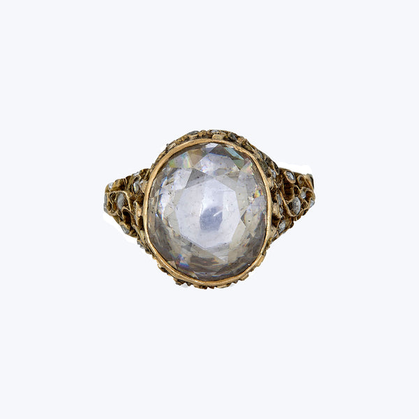 With all the makings of a jewel from this time period - the rustic rose cut, her foil backing, and ornate metalwork that you can tell was forged by hand. The purpose of the foil backing on the center stones is to increase the sparkle and brighten up the color of the diamond, since rose cuts are often less sparkly in the traditional sense. Along the shoulders and gallery are vine and floral motifs with baby rose cuts peppered throughout,...