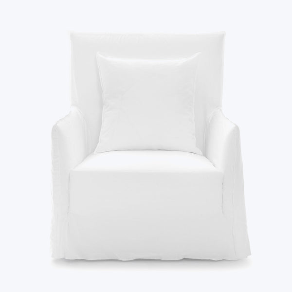 Designed by Italian architect-designer Paola Navone for Gervasoni, the Ghost Slipcover Highback Armchair adds a touch of simple sophistication to any home. Featuring a tall, sturdy wooden frame padded with soft polyurethane foam, this chair offers significant comfort and support. The loose cushions, filled with luxurious mixed down, invite you to sink into new levels of relaxation. This chair's clean, defined shape is accentuated by an oversized removable slipcover, made from a luxurious blend of cotton and pre-washed linen. Visible...