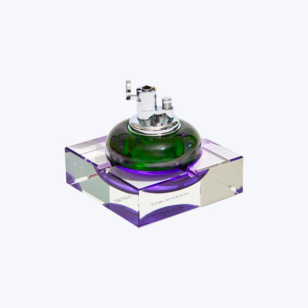 Nested, two-piece glass tabletop lighter and illusion base ashtray with 4 rests, designed to sit together or apart. They're not just home accessories; they're conversation starters! Made of both molded and cut glass, paired with a high shine chrome torch lighter insert, bask in the mesmerizing glow of these candy colored, geometric glass sets.