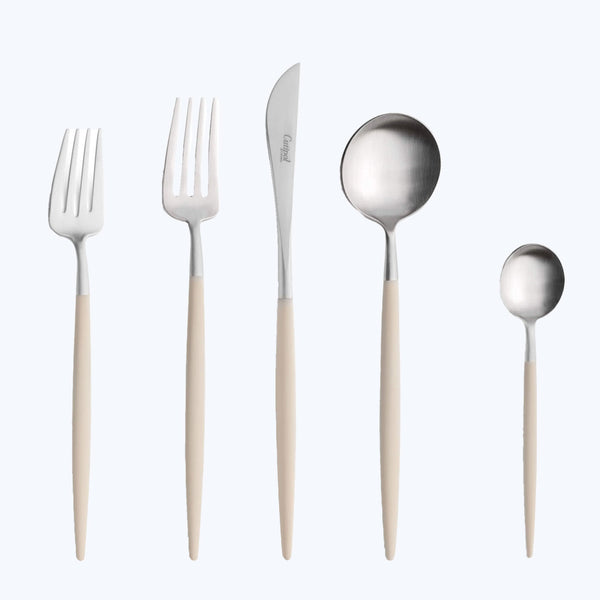 The intersection between modern design and traditional craftsmanship, Goa flatware is an ergonomic study in shapes. Refined in design, stainless steel is forged with elongated handles and dipped in sleek white resin for a balanced and controlled weight and feel. Cutipol sparks a creative force in traditional design.