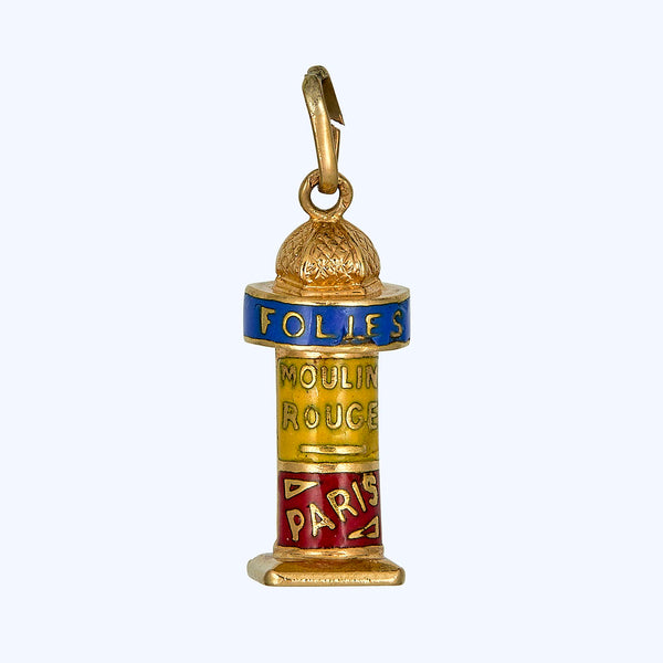 The Gold Enamel Pole Charm features a vibrant color scheme with intricate detailing resembling the iconic Moulin Rouge windmill. Crafted from 14k Yellow Gold, this 1980s/1990s charm boasts quality enamel work and a loop for easy attachment. A must-have for lovers of Parisian cabaret history.