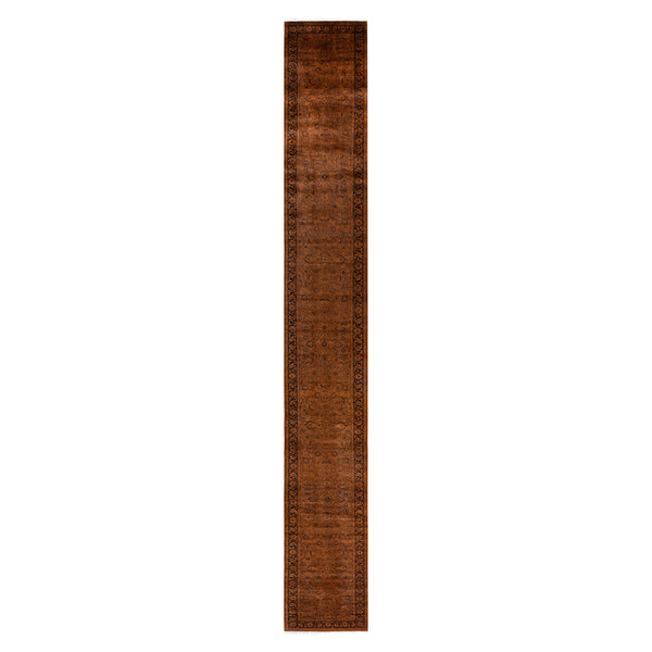 This Gold Overdyed Wool Runner measures 2'8" wide by 21'3" long, providing a substantial accent for extended spaces. Crafted from 100% wool, this runner offers natural durability and a soft texture. Each rug is hand-knotted by artisans in Pakistan, a traditional method that ensures the piece's construction quality and resilience. The overdyed process gives the rug its distinct appearance. Traditional rugs are re-dyed to achieve a saturated, uniform color. This runner features a deep, burnished gold hue that can lean...