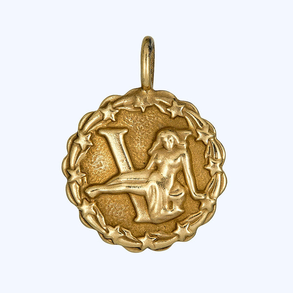 The Gold Star Wreath Virgo Charm is a vintage-inspired piece crafted from 14k Yellow Gold. The round pendant features a detailed design with a woman, stars, and a large V. The brushed finish adds a sophisticated touch to this celestial-themed charm. Perfect for adding a unique touch to any necklace or bracelet.