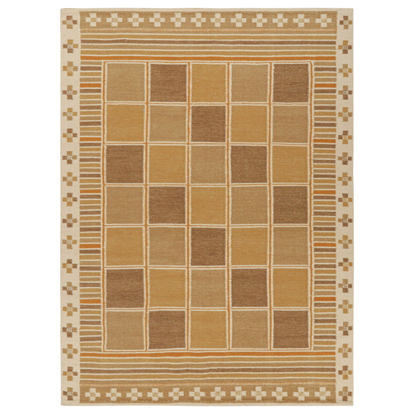 This hand-woven flatweave rug, inspired by Swedish design, measures 9 feet by 12 feet 3 inches. It combines a durable wool blend with a distinctive geometric pattern, offering both style and practicality for a range of interior settings. The rug's central field presents a grid of alternating squares, featuring a warm palette of gold, tan, and various brown tones, delineated by subtle ivory lines. This pattern is bordered by horizontal stripes in harmonizing earthy shades, leading to an outer band...