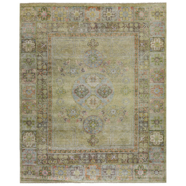 This Green Alchemy Traditional Silk Rug, measuring 8'0" x 10'0", is a product from the Alchemy Rug Collection. Crafted in India, this hand-knotted rug is made from 100% silk, offering a refined texture and a subtle natural sheen. The rug features a primary color palette of muted sage and olive greens, forming a foundation for its intricate design. A central medallion-like pattern anchors the rug, surrounded by layered borders. These borders and the central field incorporate detailed floral and geometric...