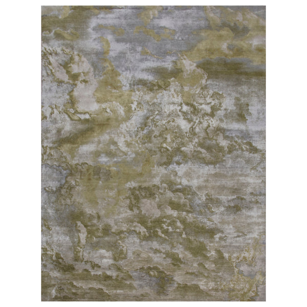 This Green Contemporary Silk Wool Blend Rug - 9' x 12' features an abstract design with blended shades of gray and green. Hand-knotted in India, this contemporary rug offers a modern and organic look with a sense of depth and texture. Crafted from a luxurious silk wool blend, this high-end piece is sure to add visual interest to any room.