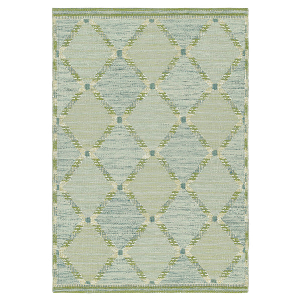 The Green Flatweave Swedish Inspired Wool Rug measures 4'1" x 6', offering a versatile size for various interior spaces. This hand-woven rug is crafted from wool, providing durability and a distinct texture. Its design draws inspiration from classic Swedish aesthetics, featuring a sophisticated pattern and a soothing color palette. The flatweave construction creates a low-profile surface. The pattern features interlocking diamond motifs, alternating between a pale, muted aqua-green and a soft, slightly warmer light green. These diamonds are outlined by...