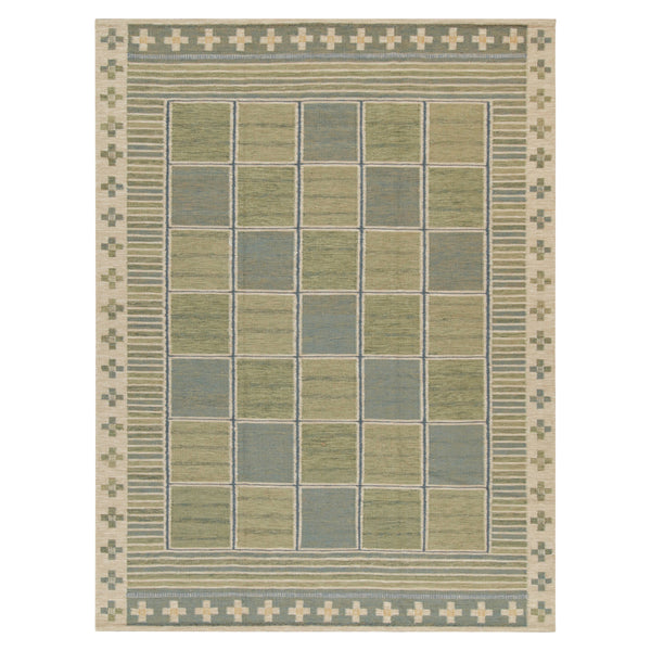 This hand-woven flatweave rug measures 6 feet by 9 feet, offering a durable and distinct addition to any interior. Crafted from wool, it features a design that draws inspiration from Swedish aesthetics, combining geometric patterns with a natural color palette. The rug's central field presents a grid of alternating squares in soft green and muted blue-gray tones, outlined by subtle darker lines. This central pattern is framed by a series of horizontal bands, incorporating shades of green, blue-gray, and cream....