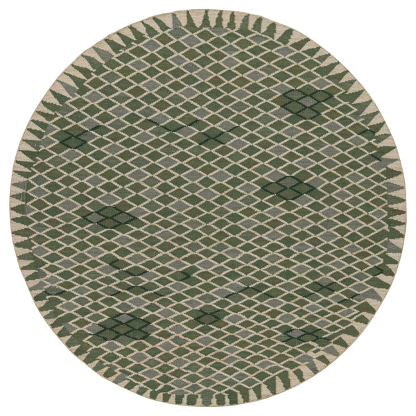 This Green Flatweave Swedish Inspired Wool Rug measures 7 feet 10 inches in diameter, making it a suitable size for various rooms. Hand woven from wool, this circular rug combines the durable construction of a flatweave with the distinct aesthetic of kilim rugs. It features a palette of green shades, accented by an off-white or light beige. The rug's design presents a geometric diamond pattern across its central field. These diamonds are woven in varying tones of green, outlined by...