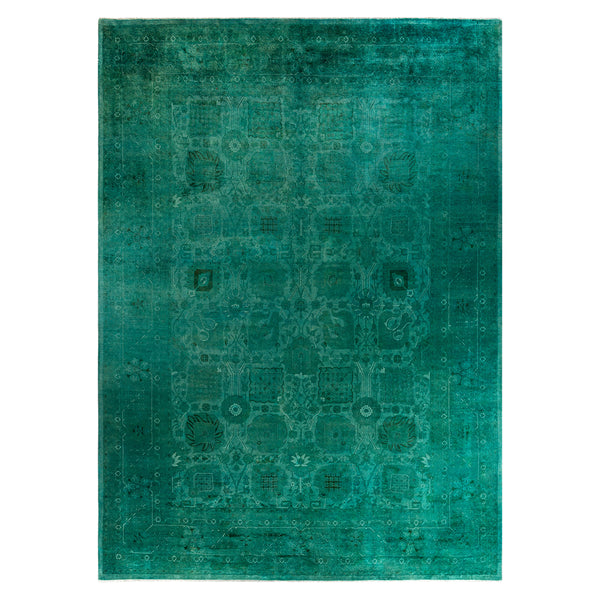 This Green Overdyed Wool Rug measures 10'1" x 13'10", providing a substantial floor covering for large spaces. Hand-knotted from natural wool in Pakistan, this rug combines traditional craftsmanship with a distinctive modern finish. The overdyed technique gives the rug its vibrant green color, which varies in intensity across the surface. This process re-colors an existing traditional pattern, allowing its faint outlines and motifs to subtly emerge through the deep green, creating a distressed, vintage appearance. The intentional color shifts and...