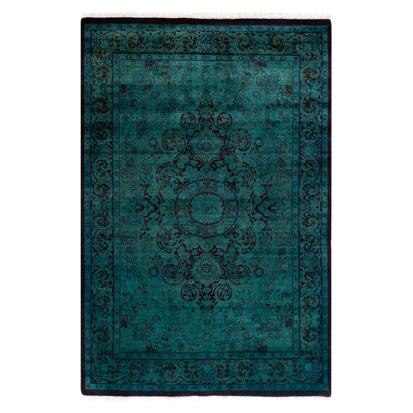This Green Overdyed Wool Rug - 4'1" x 6'1" is a beautifully crafted piece from Pakistan. Hand-knotted with intricate teal and maroon patterns, this traditional overdyed rug features a central circular motif surrounded by ornate floral and geometric designs. The high-quality wool material adds texture and durability to this exquisite piece.
