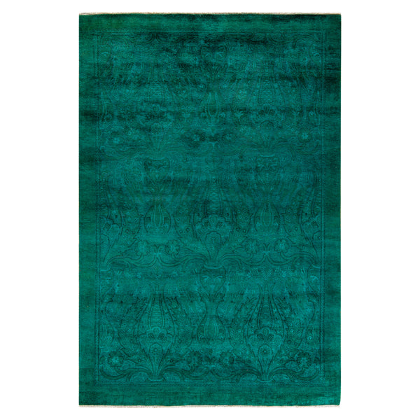 This overdyed wool rug offers a blend of traditional craftsmanship and contemporary style. Measuring 5'3" by 7'10", this hand-knotted piece features a rich green color achieved through a specialized overdying process. This technique gives the rug a unique depth, allowing subtle patterns from its original design to emerge beneath the vibrant top layer. Crafted from durable wool, the rug provides both softness underfoot and natural resilience. Wool is known for its ability to resist dirt and stains, making it suitable...