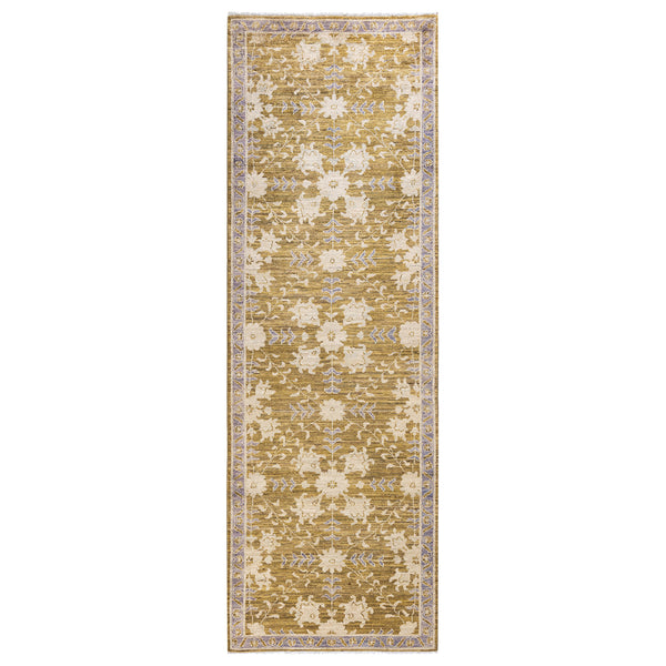 The Green Traditional Wool Runner - 3' 4" x 9' 10" comes from India. Hand-knotted out of wool, it features intricate floral motifs with hints of blue and detailed ornamentation in shades of beige and gold. The symmetrical design exudes traditional elegance, while the high-quality construction ensures lasting beauty.