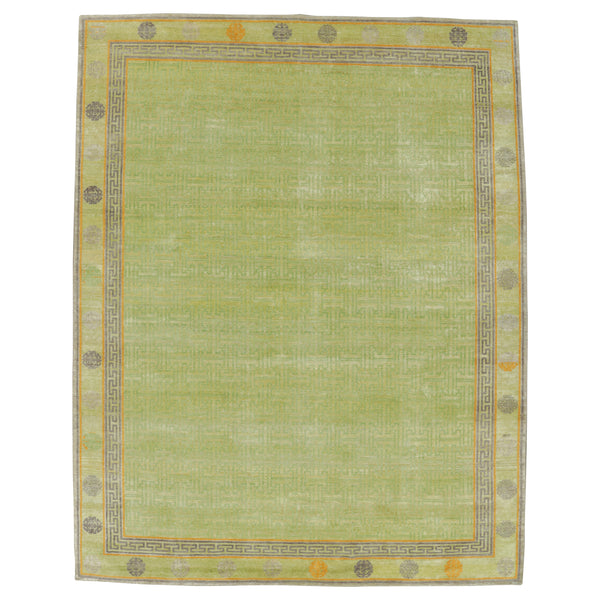 This Green Traditional Wool Silk Rug measures 8'1" x 10'3", providing a substantial floor covering for various spaces. Originating from India, this hand-knotted area rug combines durable construction with classic design elements. The primary light green color offers a refreshing and adaptable foundation for interior decor. Crafted from a blend of wool, silk, and cotton, this rug offers a balance of softness and resilience. The hand-knotted technique, a traditional artisan method, ensures each rug is unique and built for lasting...