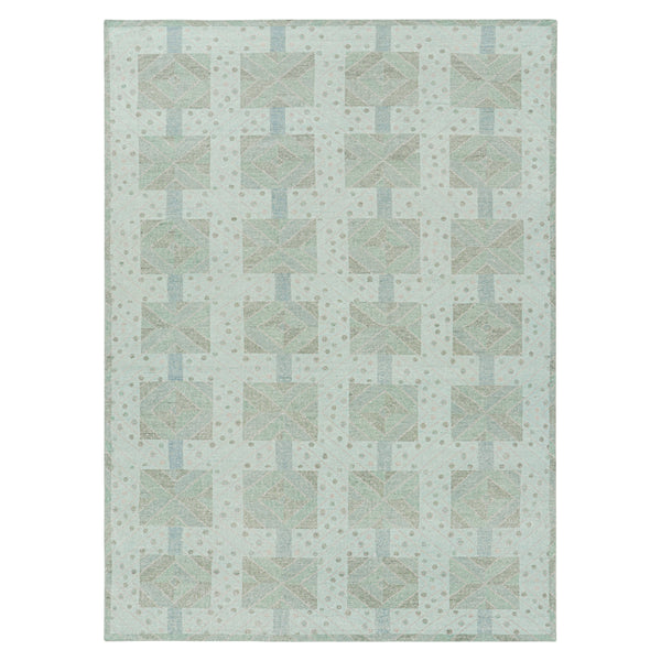This Green Transitional Swedish Inspired Wool Rug, measuring 10'1" x 13'10", offers a blend of modern design and skilled craftsmanship. As a hand-knotted piece crafted from wool, it provides both durability and a comfortable underfoot texture. Its large size and transitional style make it suitable for various rooms, including living areas, dining spaces, or spacious bedrooms, providing a distinct and calming aesthetic. The rug features a soft, muted sage green background, subtly adorned with small, scattered dots in a beige-greige...