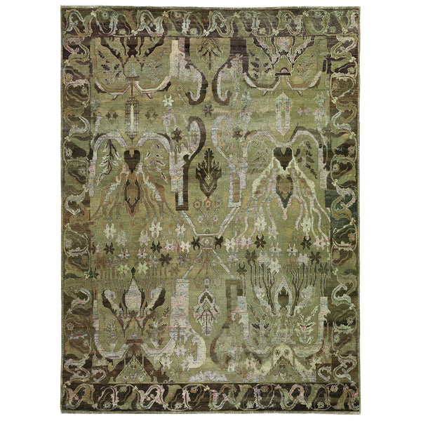 This Sage Alchemy area rug offers a transitional design, blending contemporary aesthetics with classic influences. Measuring 9 feet by 12 feet 3 inches, this large format rug is suitable for various room settings. Hand-knotted in India, this rug features a blend of wool and silk. The wool content provides natural durability and a soft feel underfoot. Silk fibers are incorporated to add a subtle sheen and highlight the intricate details of the pattern. The design showcases a primary sage green...