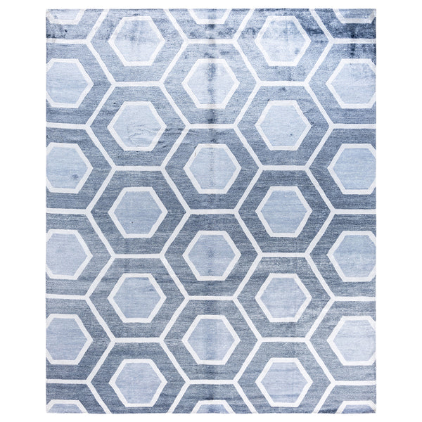 This contemporary area rug, though named a "Wool Rug," is expertly crafted from 100% pure silk, offering a luxurious feel and subtle sheen. Measuring 8' 2" x 10' 0", this hand-knotted piece from India anchors any room with its substantial size and distinctive design. The rug features a captivating geometric pattern of interlocking hexagons. Its grey color palette encompasses various shades, with darker grey tones forming the background of the larger hexagonal shapes, while lighter grey fills the inner hexagons....