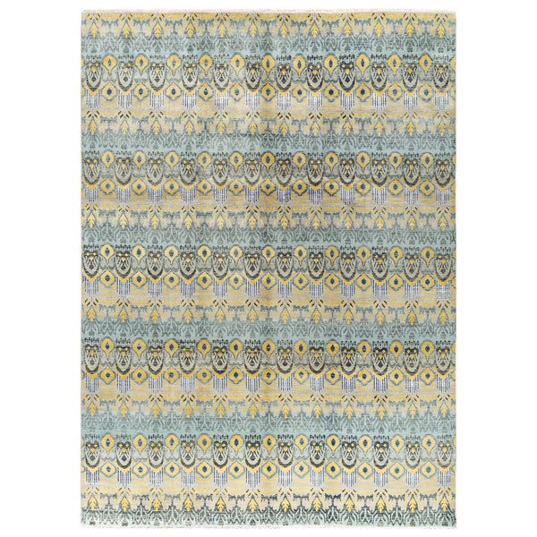 This 9' 0" x 12' 1" contemporary area rug is hand-knotted in India, showcasing expert craftsmanship. It is constructed from a blend of 90% wool and 10% silk, combining the natural durability and resilience of wool with the soft sheen and luxurious feel of silk. The rug features a transitional design with a horizontally striped pattern. This pattern is composed of repeated, stylized motifs. Hues of light blue and yellow are prominent, accented by subtle grey tones and darker grey...