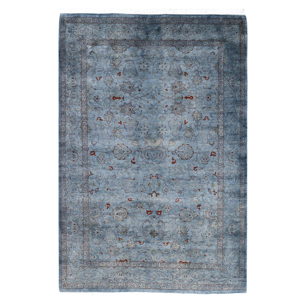 This hand-knotted overdyed wool rug measures 4 feet 2 inches by 6 feet 2 inches. Originating from Pakistan, it features a durable wool construction. The rug's distinct overdyed finish creates a faded blue appearance, which subtly reveals traditional patterns beneath. This process softens the original design, blending classic motifs with a contemporary aesthetic. The blue color provides a versatile base for various interior designs. Hand-knotted construction contributes to the rug's durability, making it suitable for active areas such as living...