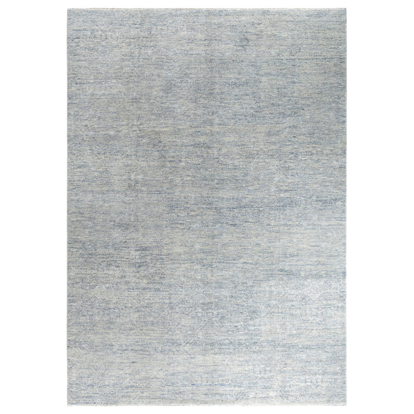 This Grey Solid Wool Silk Blend rug, measuring 9' x 12'4", from India, features a subtle light blue and gray color with a traditional damask-like pattern. Hand-knotted from 80% Wool, 20% Silk, this high-quality rug has a vintage-style appearance.