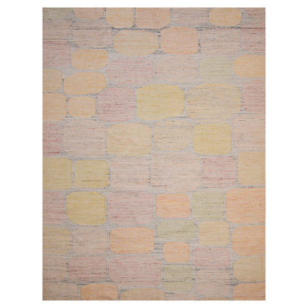 This Multicolored Swedish Inspired Flatweave Art Silk Rug measures 6 feet by 9 feet, presenting a modern design that enhances various interior spaces. Crafted from art silk, this flatweave rug offers a soft texture and a subtle sheen. The rug features a distinct geometric pattern composed of rounded rectangular and square shapes, artfully arranged across its surface. A palette of muted pastels defines the design, including soft shades of pink, yellow, orange, and green, set against a light, neutral background....