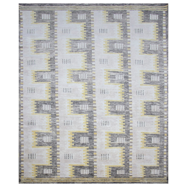 This Grey Swedish Inspired Flatweave Art Silk Rug measures 9'1" x 12'3" and brings a modern, minimalist aesthetic to any room. Its design is characterized by clean lines and geometric patterns, reflecting classic Scandinavian influence. The rug features a repeating pattern of interlocking geometric shapes, primarily in shades of light and dark grey, accented with subtle yellow details. This composition creates visual interest and depth without overpowering a space. The flatweave construction ensures a low profile, making it suitable for...
