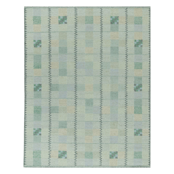 This Teal Swedish Inspired Wool Flatweave rug from India measures 9'4" x 11'11". Featuring a geometric pattern with vertical zigzag stripes in subtle green shades, creating columns of squares and rectangles in various shades of green and beige. Some squares have checkerboard or striped designs, adding texture to the muted pastel color palette. Hand-woven from 100% wool, this high-end rug exudes quality and beauty.