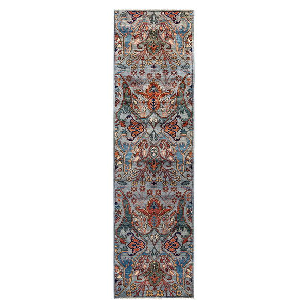This Grey Traditional Serapi Wool Runner is a hand-knotted traditional rug from Pakistan, measuring 2'10" x 10'1". Featuring a symmetrical floral motif in red, orange, blue, brown, and cream on a soft blue background, this intricate design exemplifies traditional craftsmanship. The rich color palette and detailed pattern showcase the high quality of this wool runner, perfect for adding elegance to any space.